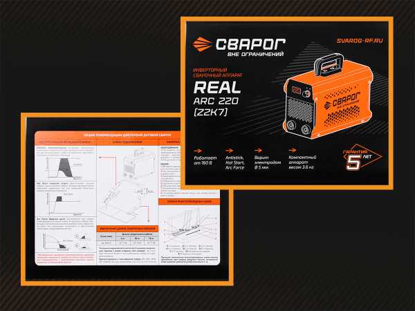 В номенклатуре Сварога появились новые инверторные аппараты для ручной дуговой сварки REAL ARC 200 и REAL ARC 220. Отличительными особенностями этих аппаратов являются: минимальный вес (3,0 и 3,6 килограмм соответственно), наличие встроенных функций форсажа дуги (Arc Force), горячего старта (Hot Start) и антизалипания (Anti Stick), возможность работы от пониженного напряжения (до 160 Вольт). Все это позволяет обеспечить надежное зажигание дуги, стабильное ее горение и минимальное разбрызгивание. Аппараты упакованы в коробки с ярким современным полиграфическим оформлением с информацией об их основных возможностях и преимуществах. Новые аппараты REAL ARC - это сбаллансированное решение для тех кто ценит простоту, надежность и стабильность сварочного процесса. Они обеспечивают качественную сварку без сложной настройки и подходят для профессионального применения.